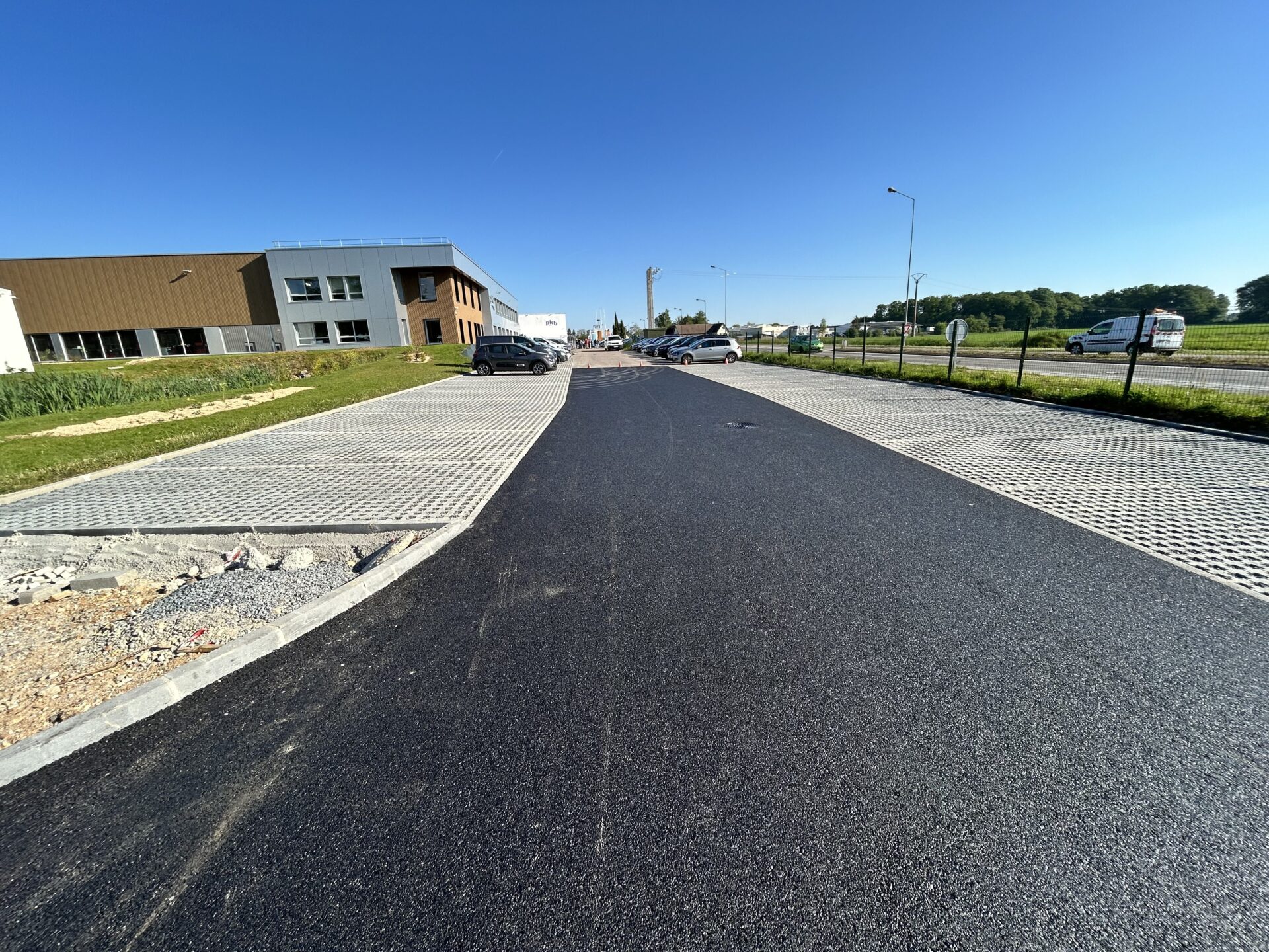Aménagement de l’extérieur, parking et espaces verts pour l’netreprise PKB.