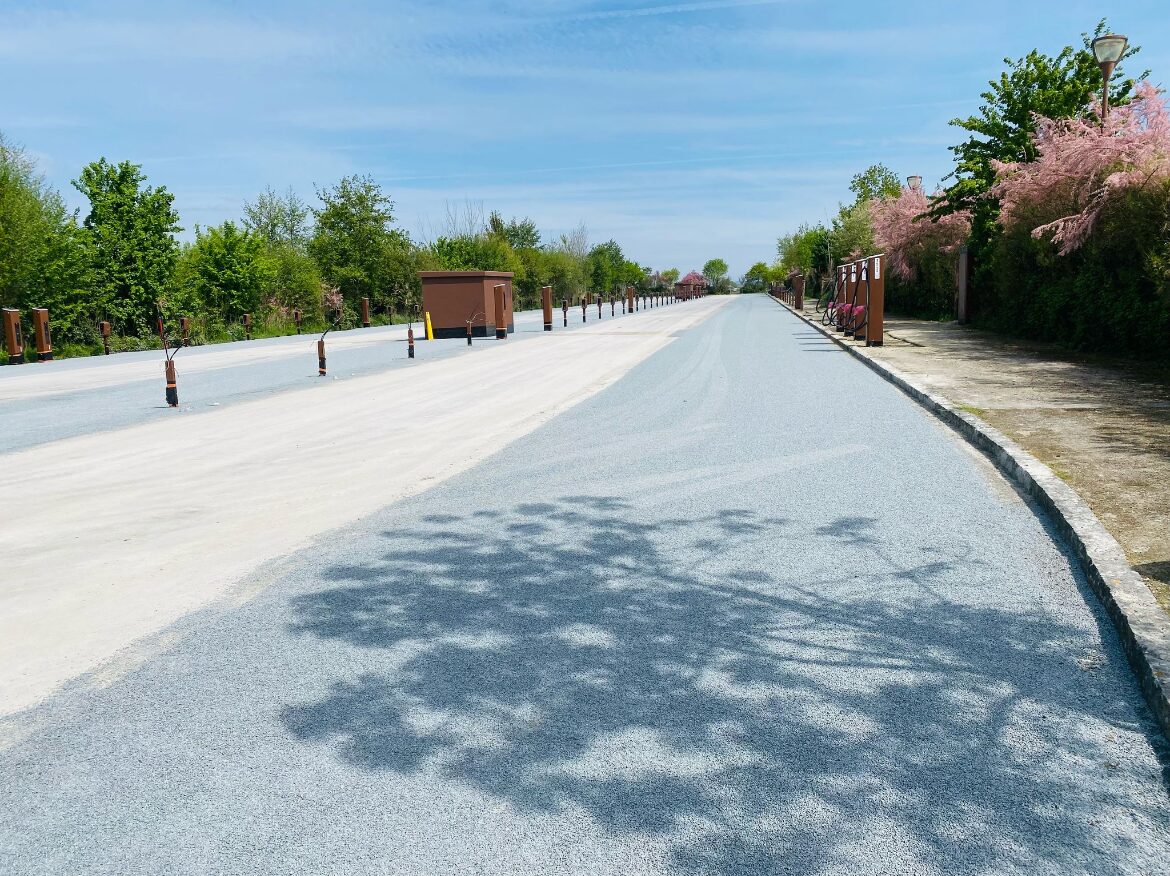 Mise en place de bordure P1, mise en place d’Evergreen remplissage en terre, réalisation de l’enrobé de couleur noir, création des réseaux toute à l’égout, réalisation des tranchées techniques, création des réseaux EP, création d’un bassin d’infiltration.